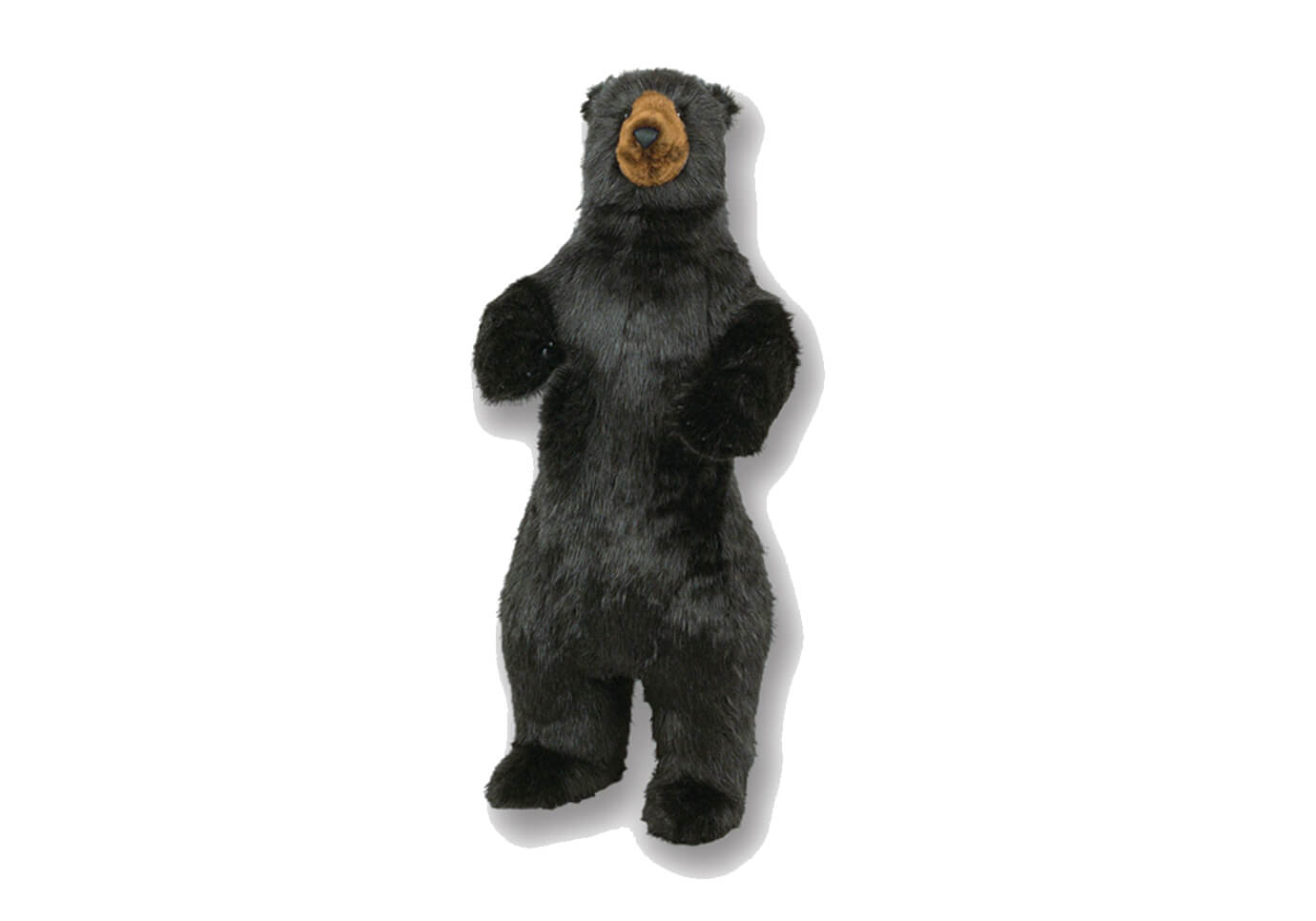Oso negro brillante, pelaje sintético suave, parado en dos patas fijas, cabeza fija y patas superiores móviles.