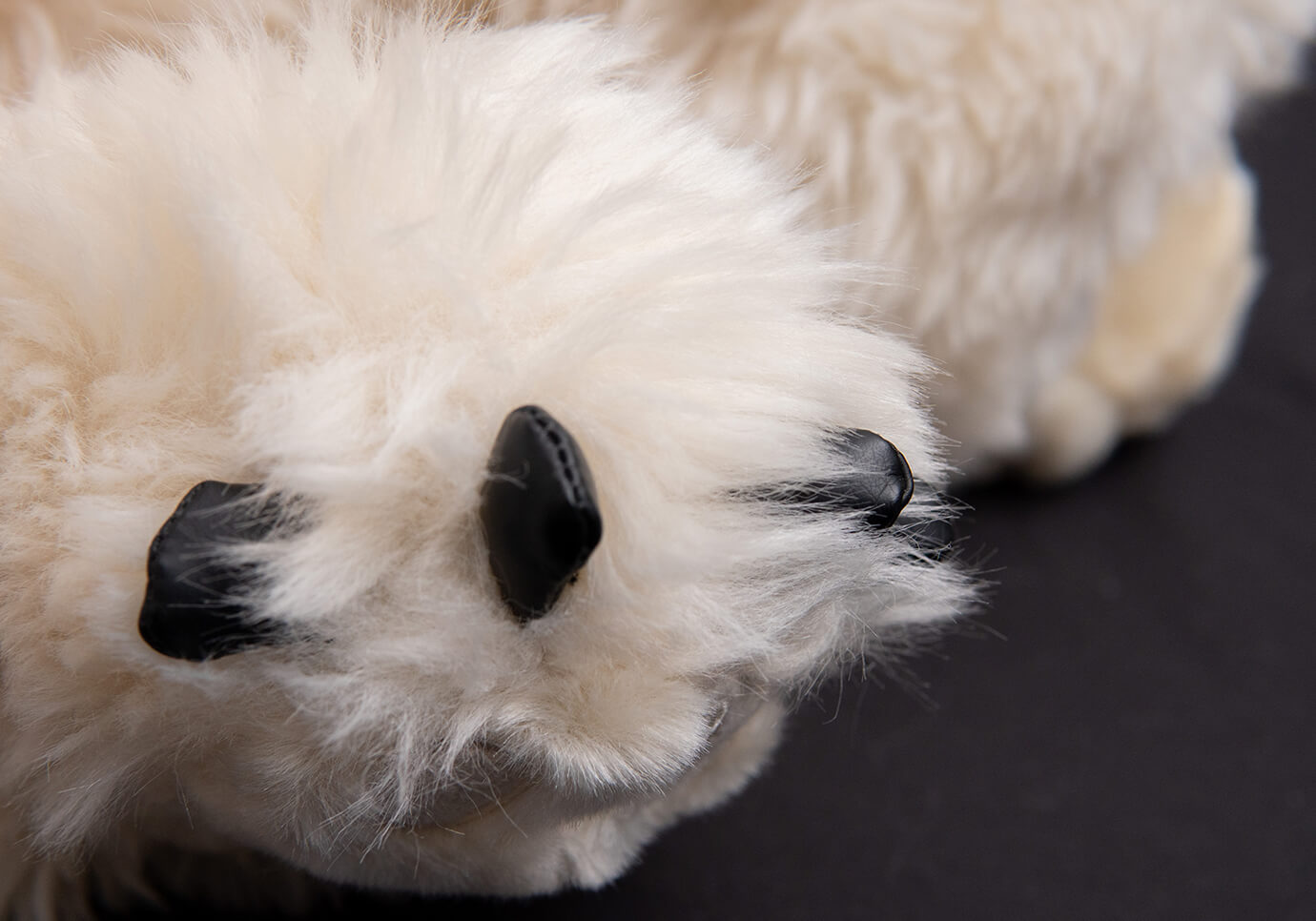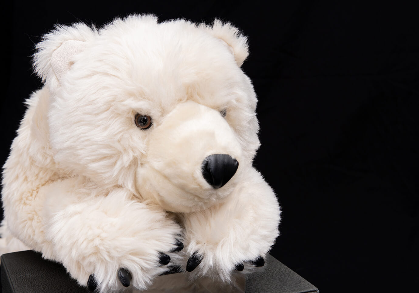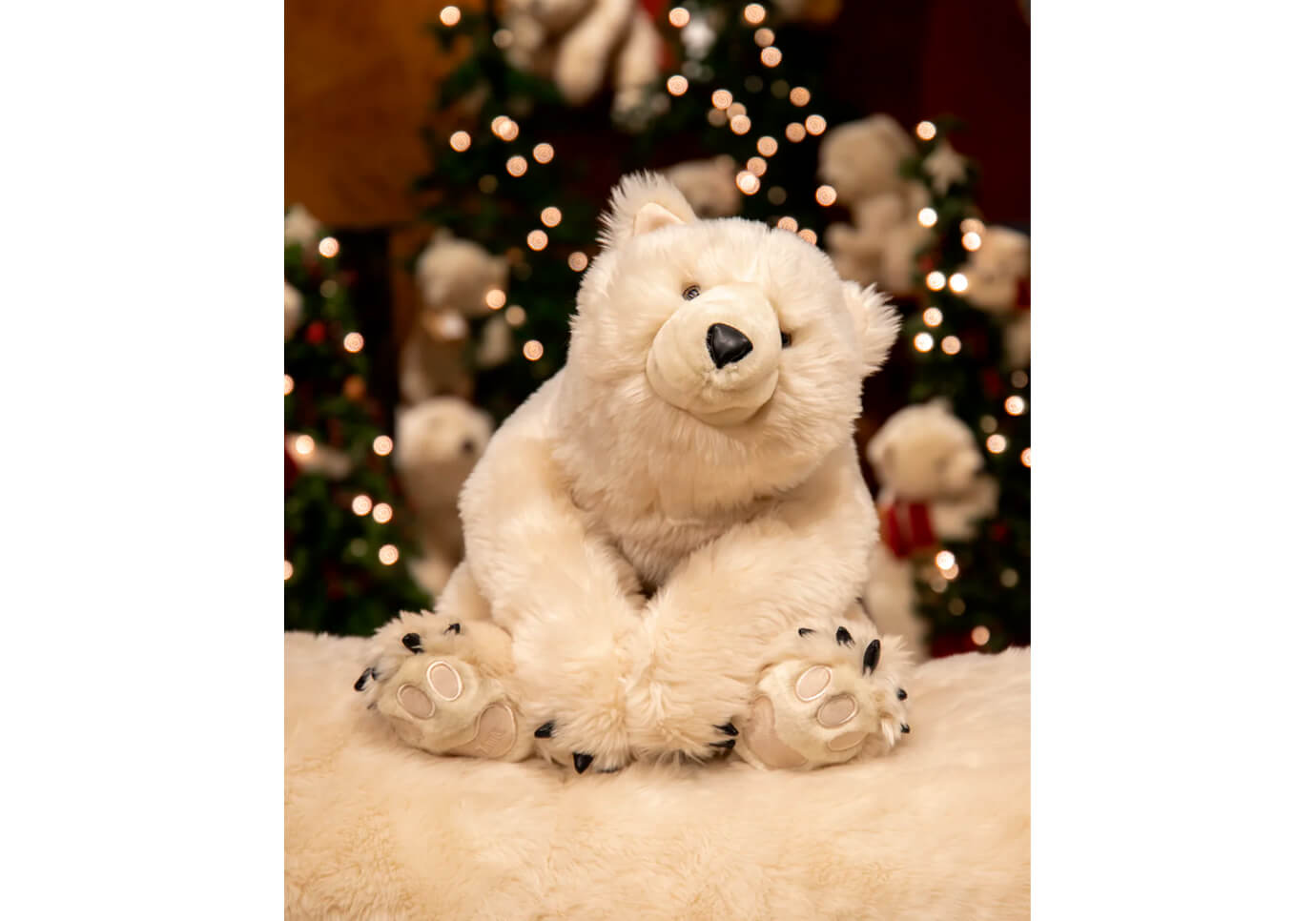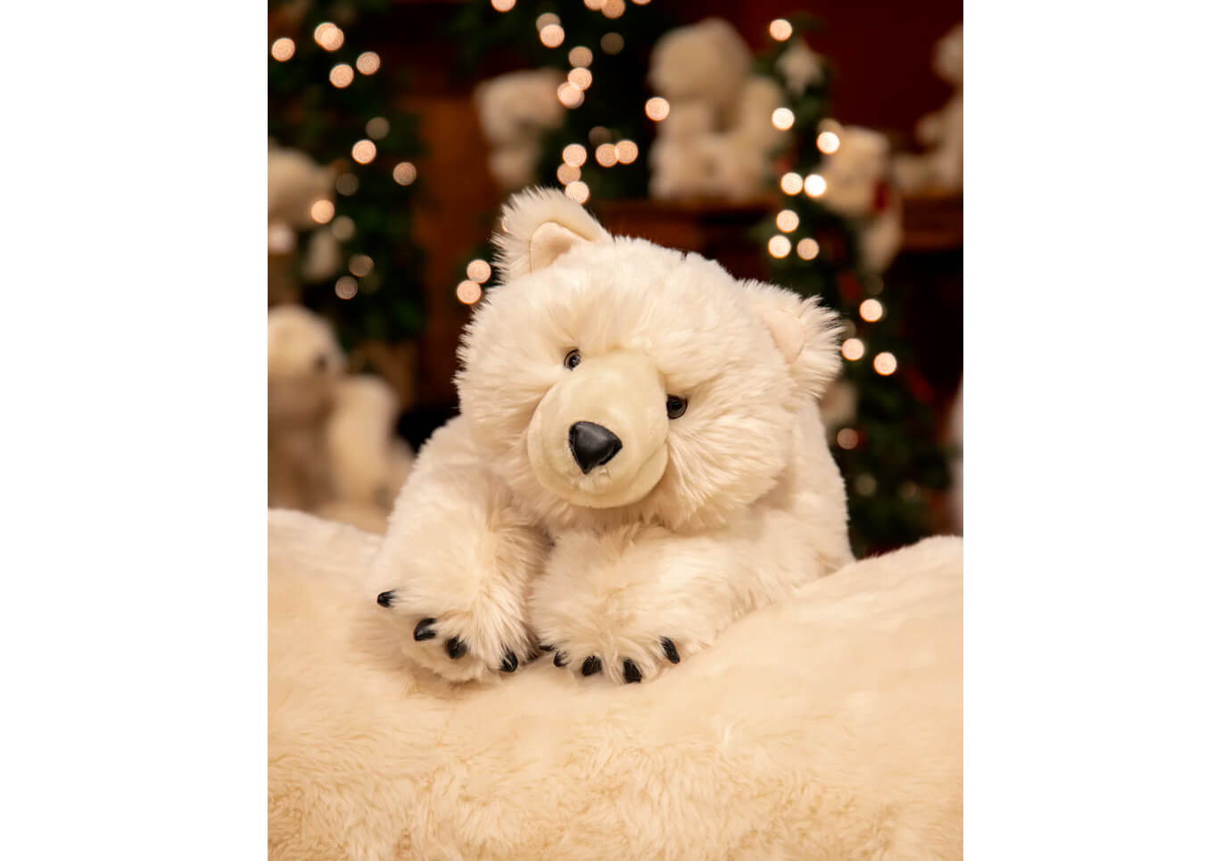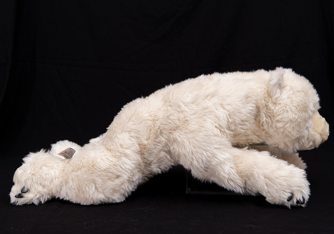 Oso polar beige claro abrazable, pelaje sintético suave, cuerpo entero sin estructura, relleno sintético.