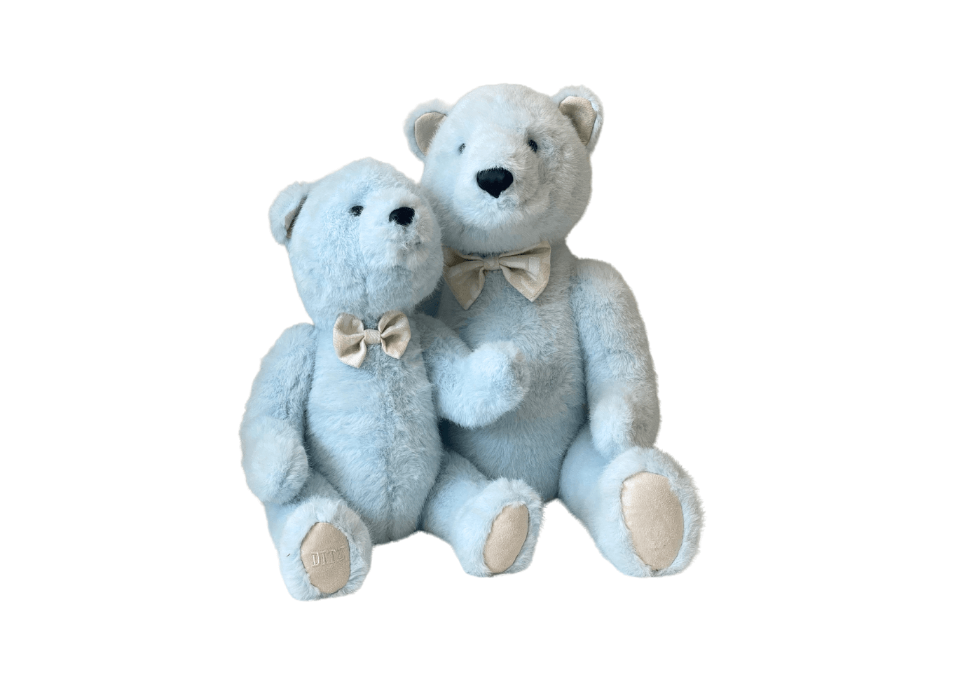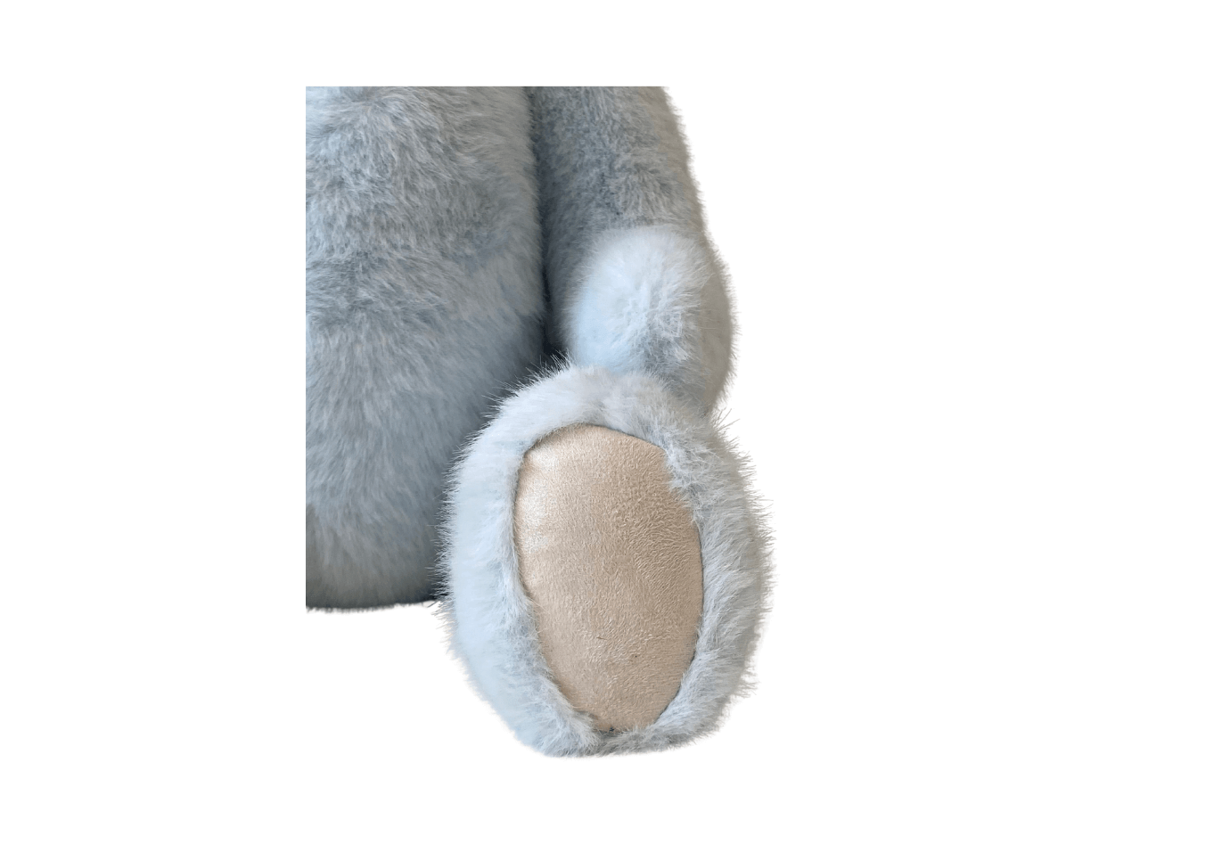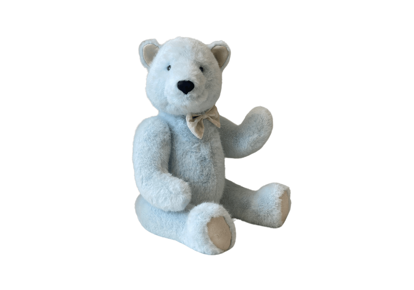 Oso polar celeste de peluche abrazable, pelaje sintético suave, cuerpo entero movible, y sentable de relleno sintético.