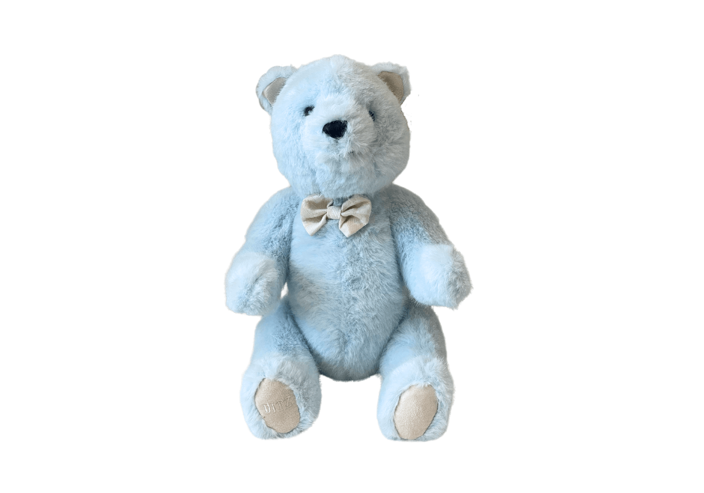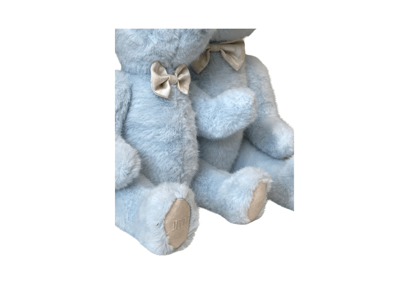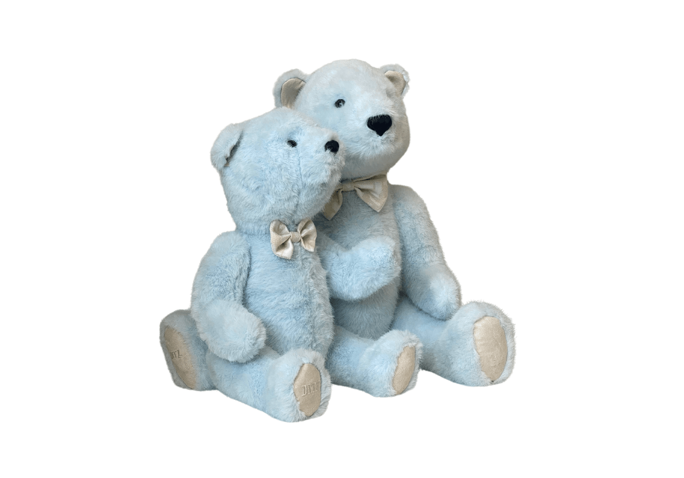 Oso polar celeste de peluche abrazable, pelaje sintético suave, cuerpo entero movible, y sentable de relleno sintético.