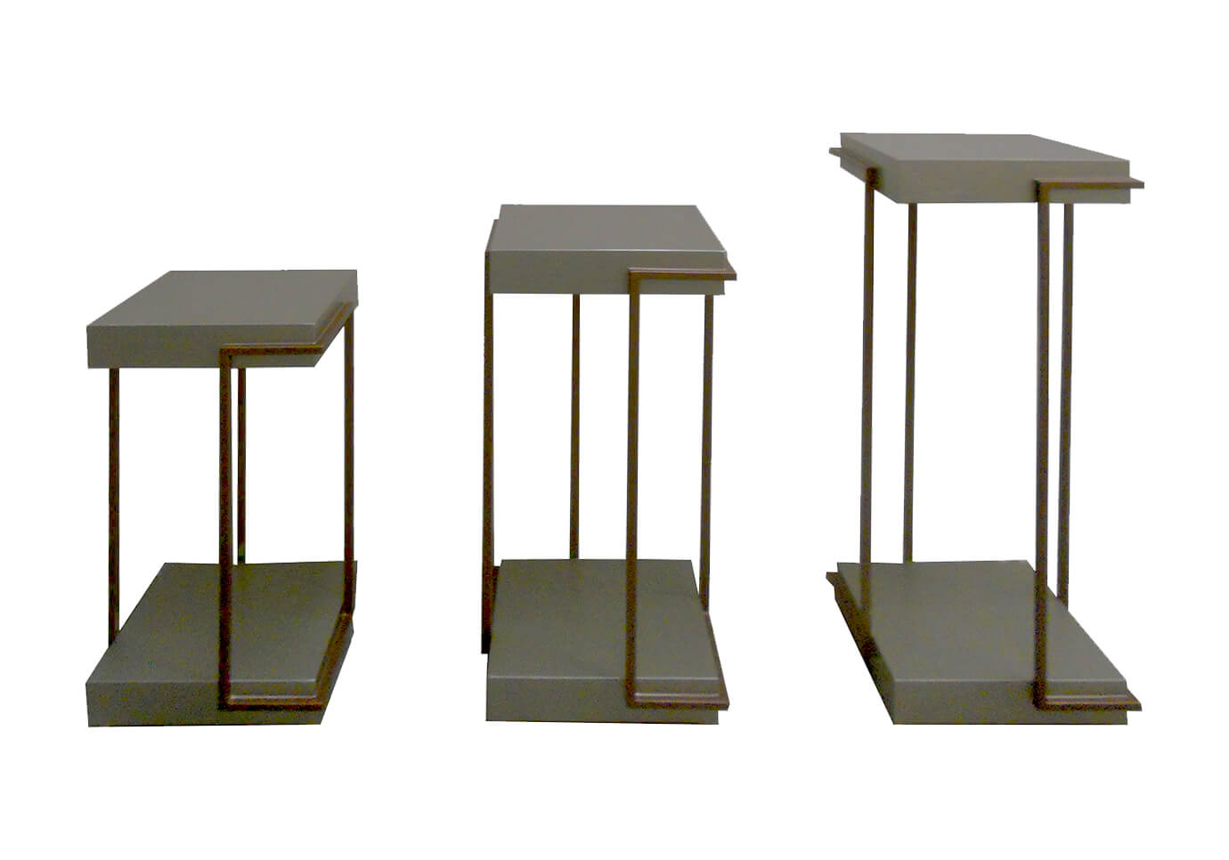 Pedestal de forja y madera acabado encino color gris, diseño de forja con base y cubierta de madera.