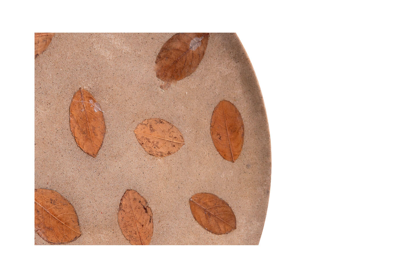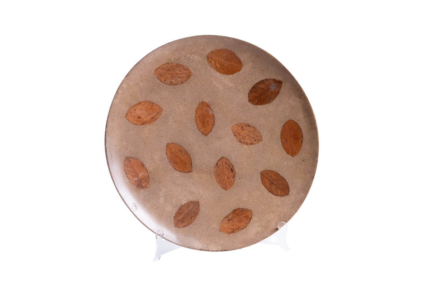 Plato redondo de fabricación artesanal color café, con incrustaciones de hojas color de otoño.