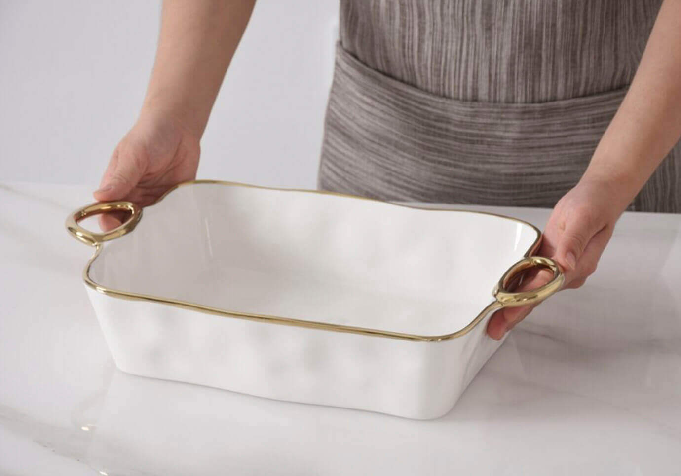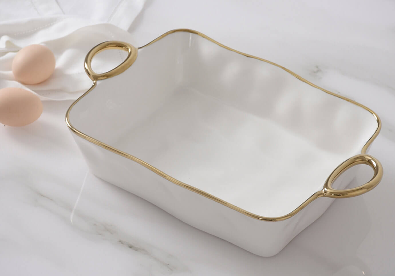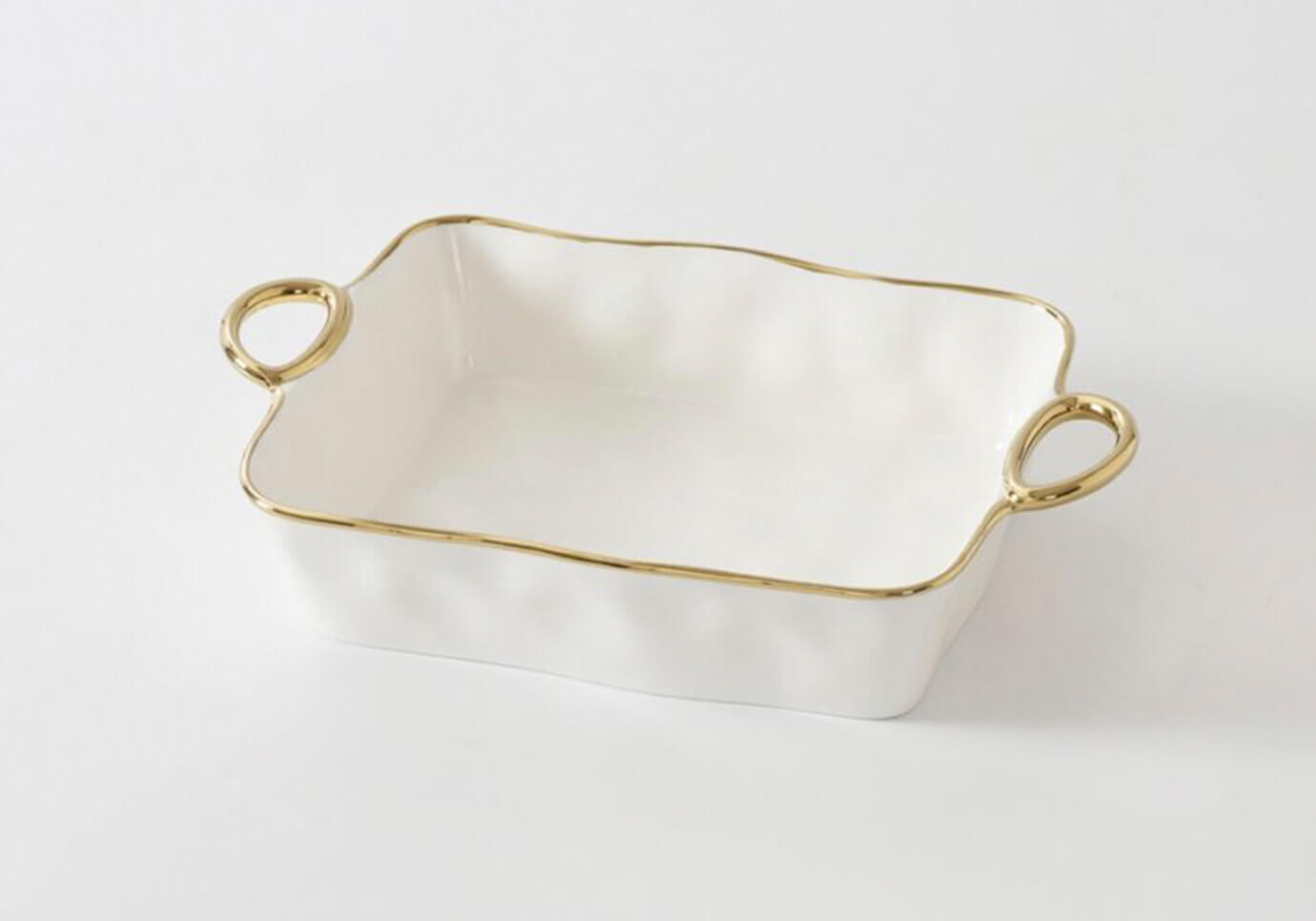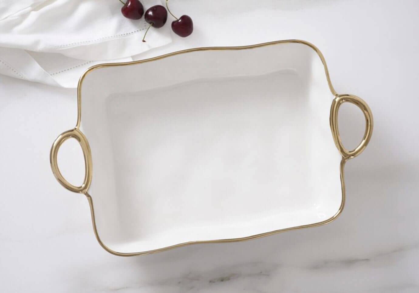 Platon Hondo de Cerámica Rectangular Blanco y Asas Doradas.