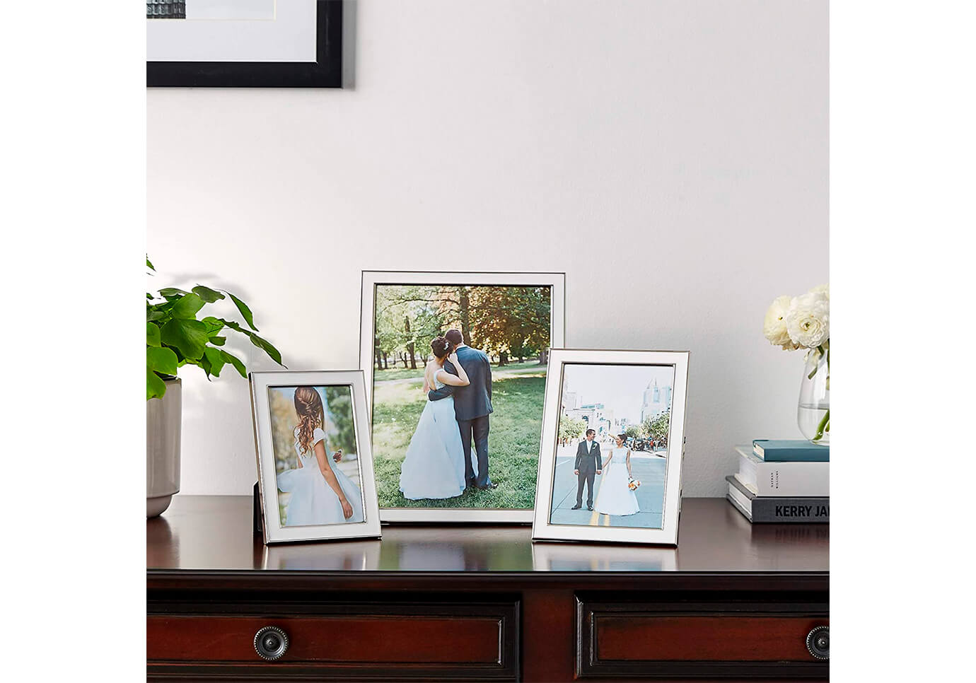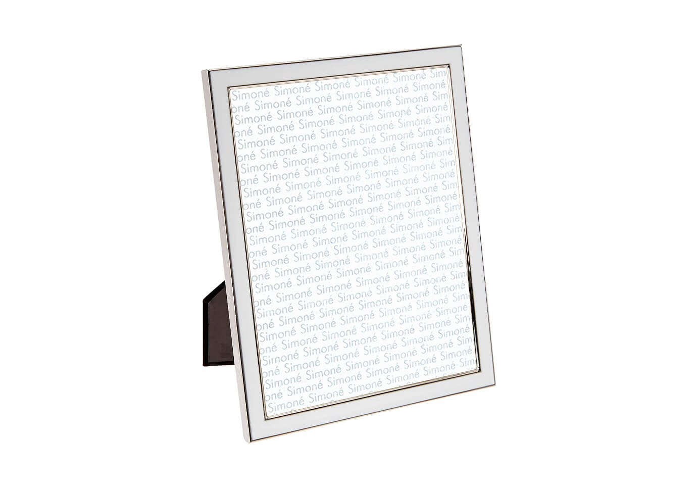 Portarretrato marco delgado de metal plateado con recuadro en blanco, respaldo terciopelo negro, pata ángulo para apoyo horizontal o vertical
