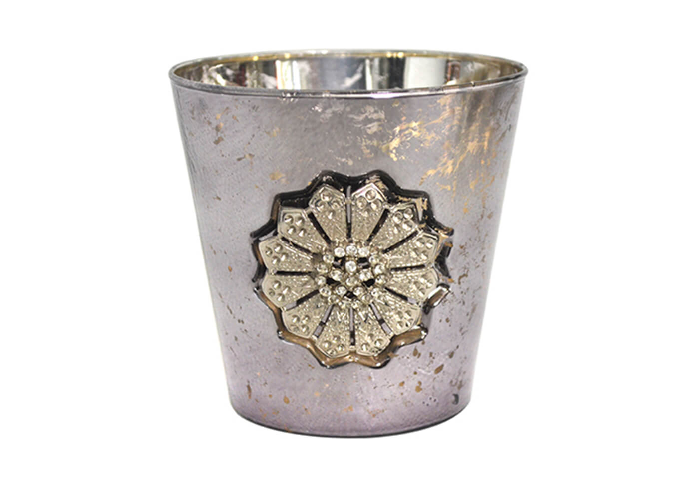 Vaso de vidrio jaspeado color morado e interior plateado brillante, con figura de flor al frente.