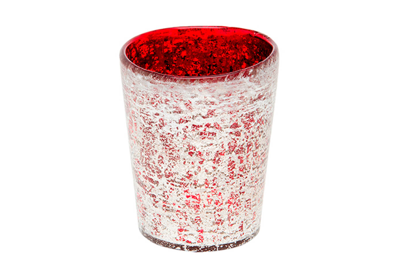 Vaso de vidrio mercurio plateado mate e interior acabado rojo brillante, boca de borde irregular.