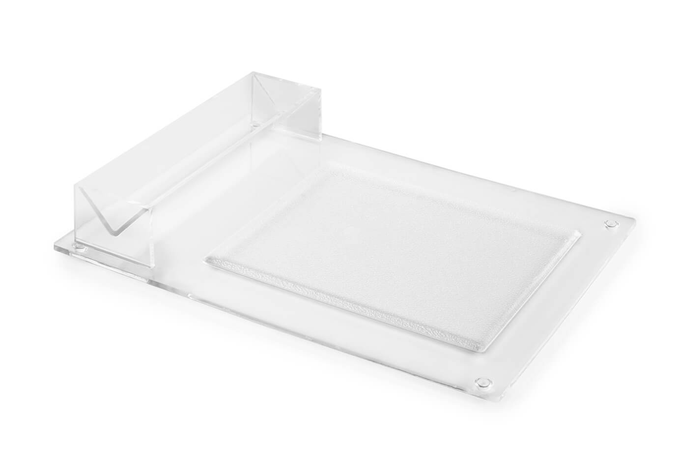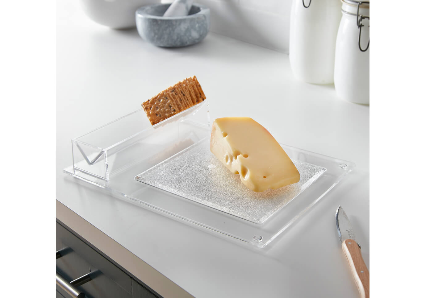 Quesera de acrílico con cuadro acabado antiderrapante y portagalletas en una sola pieza.