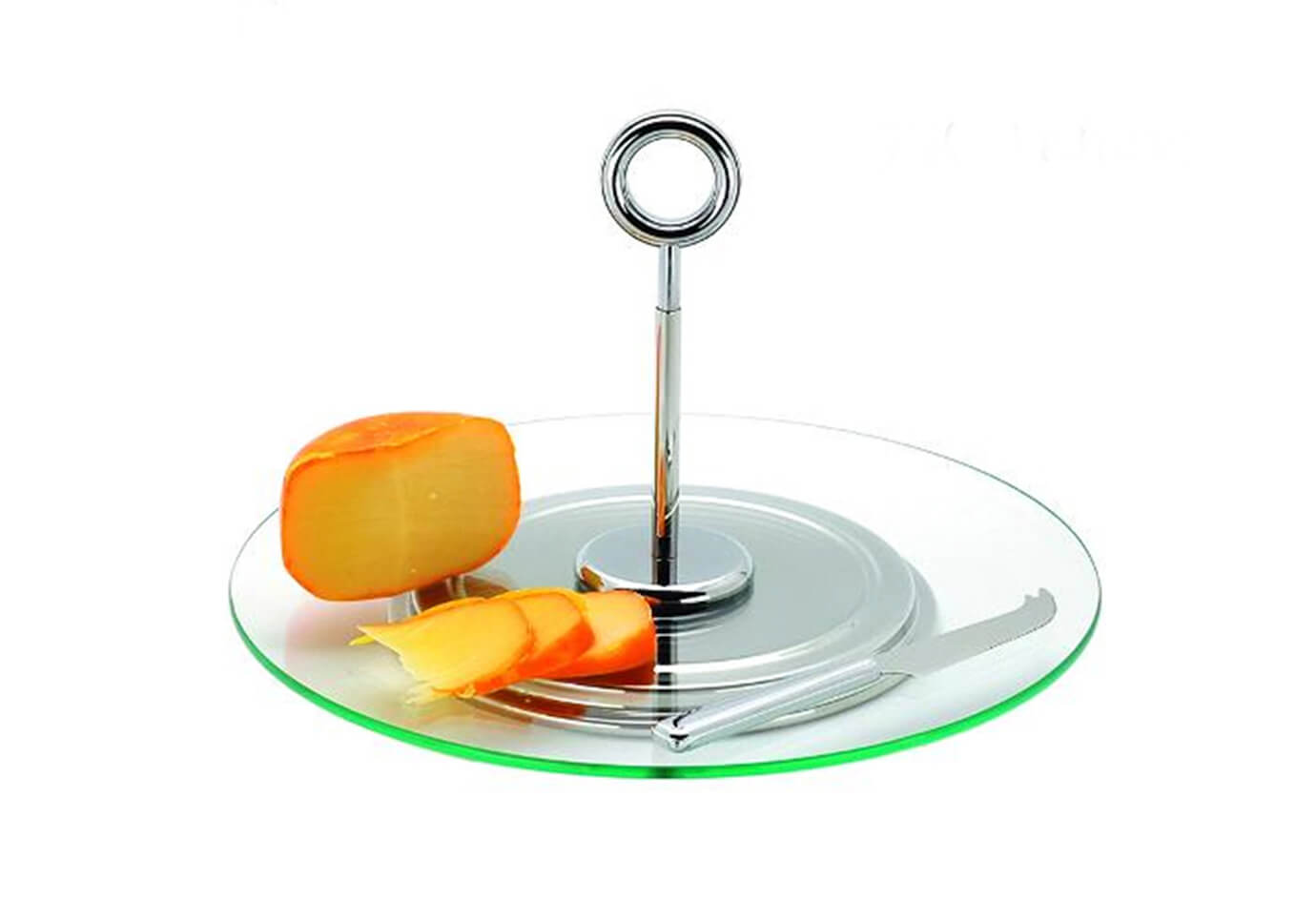 Quesera redonda de vidrio, agarradera de anillo y untador de acero inoxidable.