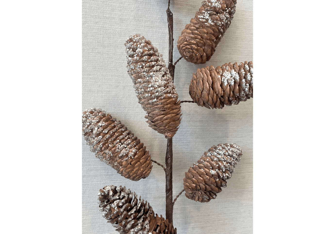 Rama de piñas de pino cafés con glitter plateado.