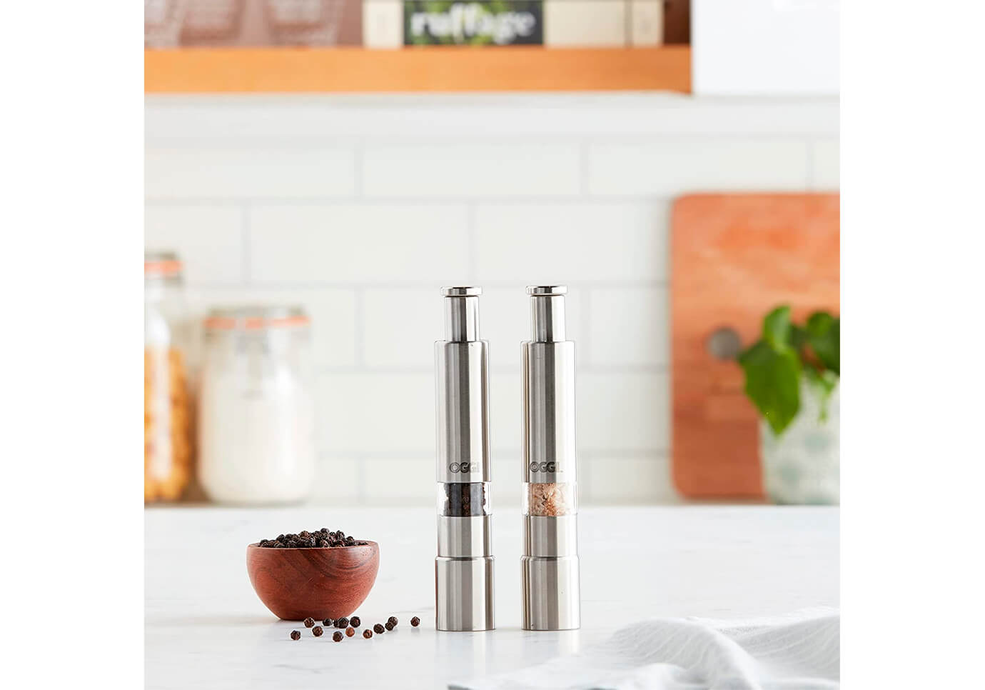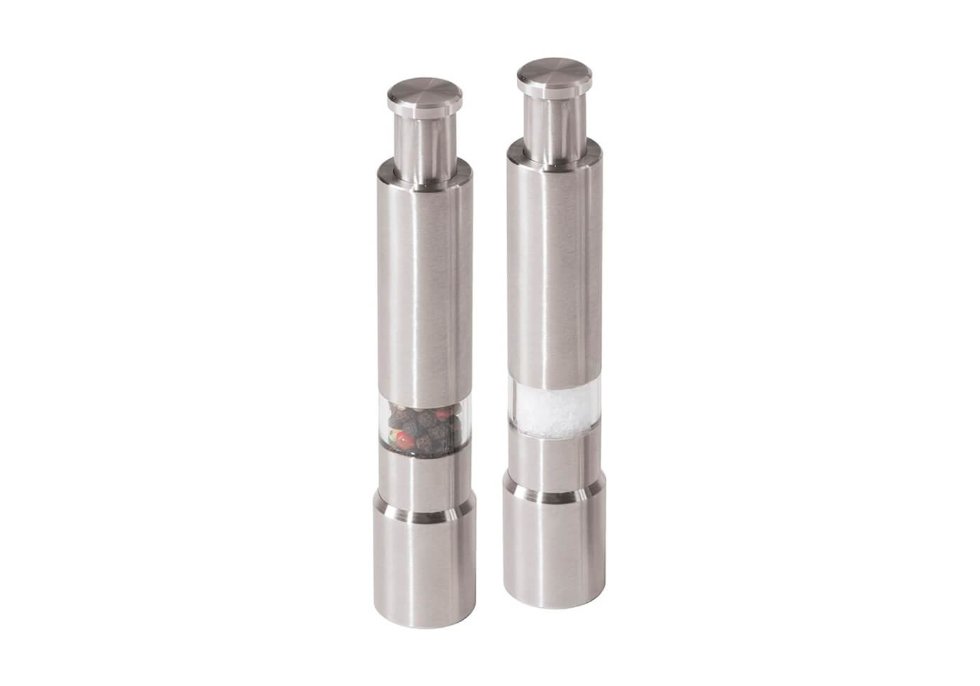 Set de salero y pimentero de carcasa de acero inoxidable satinado y ventanas transparentes, función de botón.