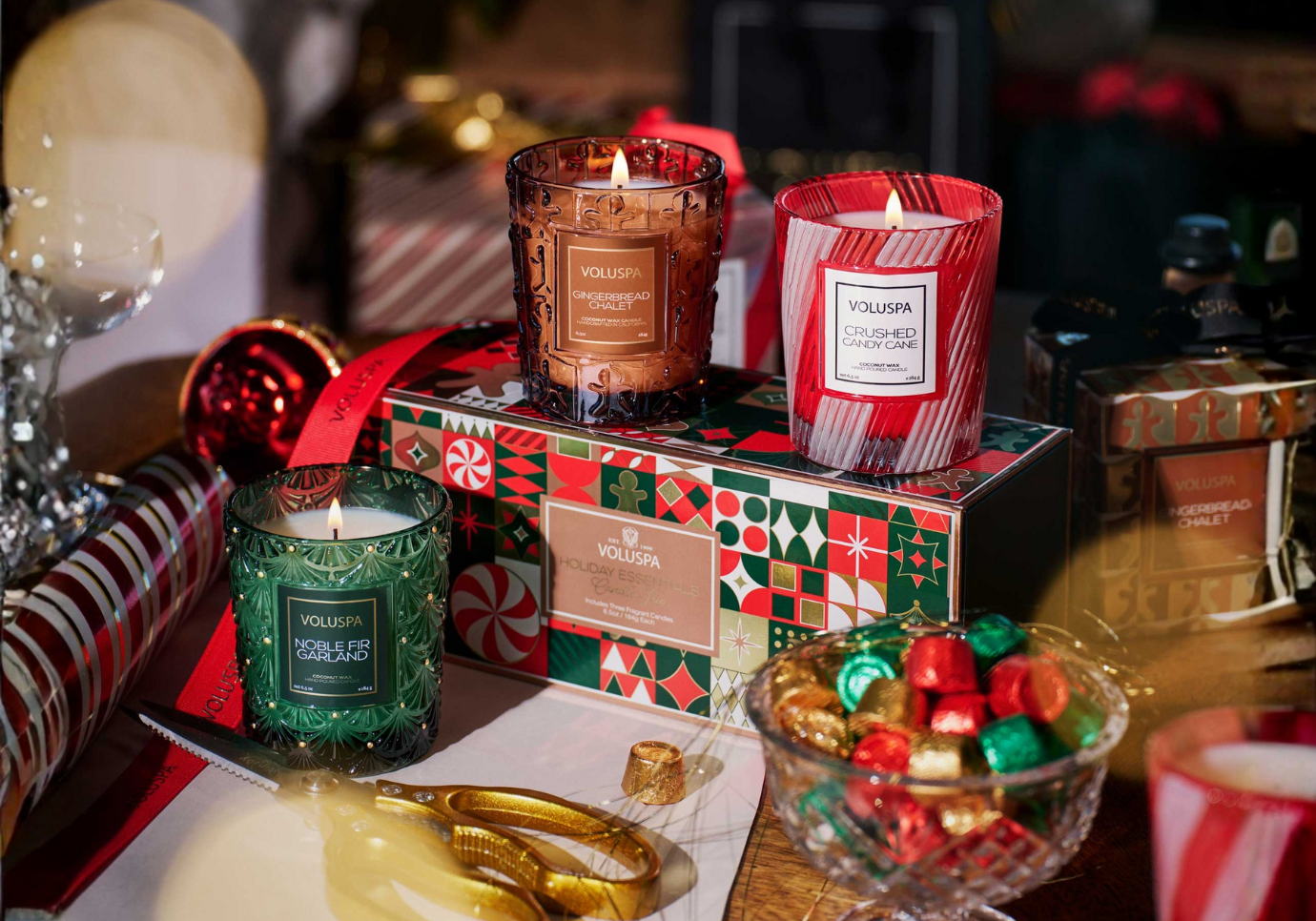 Set de 3 velas "Holiday Essentials" estas incluyen: Noble Fir Garland, Crushed Candy Cane, Gingerbread Chalet.