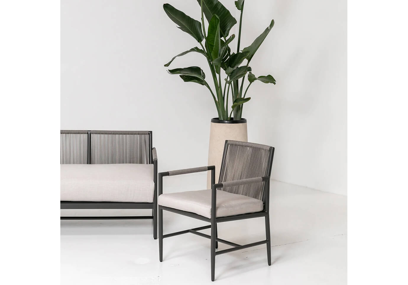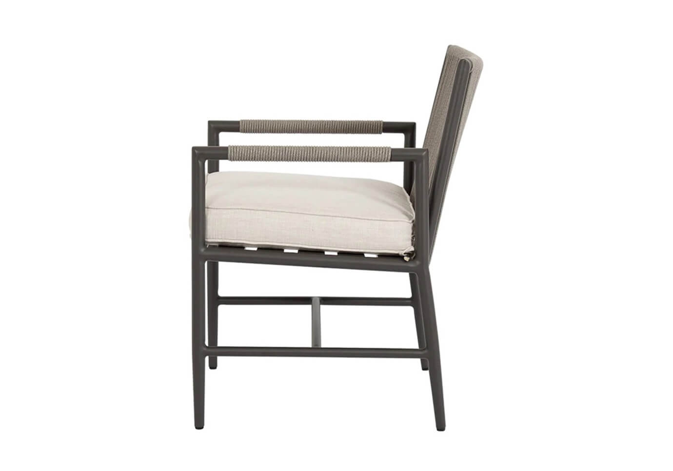 Inspirada en el diseño de mediados de siglo, la silla de comedor con brazos Petra incorpora lo mejor de las proporciones clásicas con materiales modernos. Inspirada en los tonos sutiles de la piedra natural, esta pieza está fabricada en aluminio grafito mate resistente a los rayones y completamente soldado con una cuerda en gris piedra para todo clima. Cuenta con un marco de tubo redondeado y un respaldo de tiro medio, que está perfectamente escalado para espacios más pequeños y proyecta un perfil atractivo.