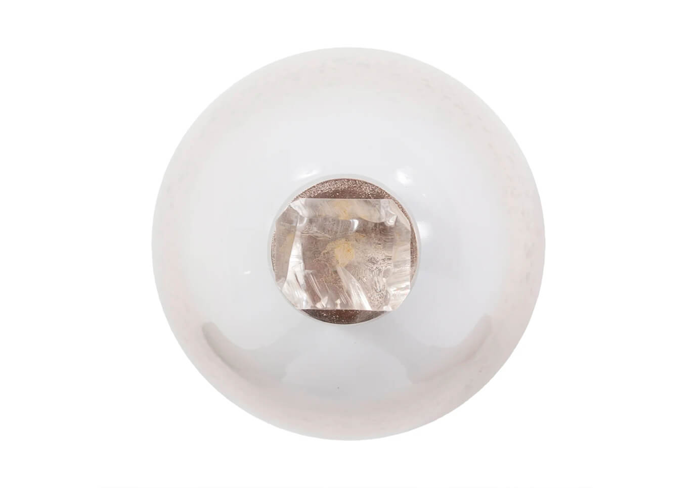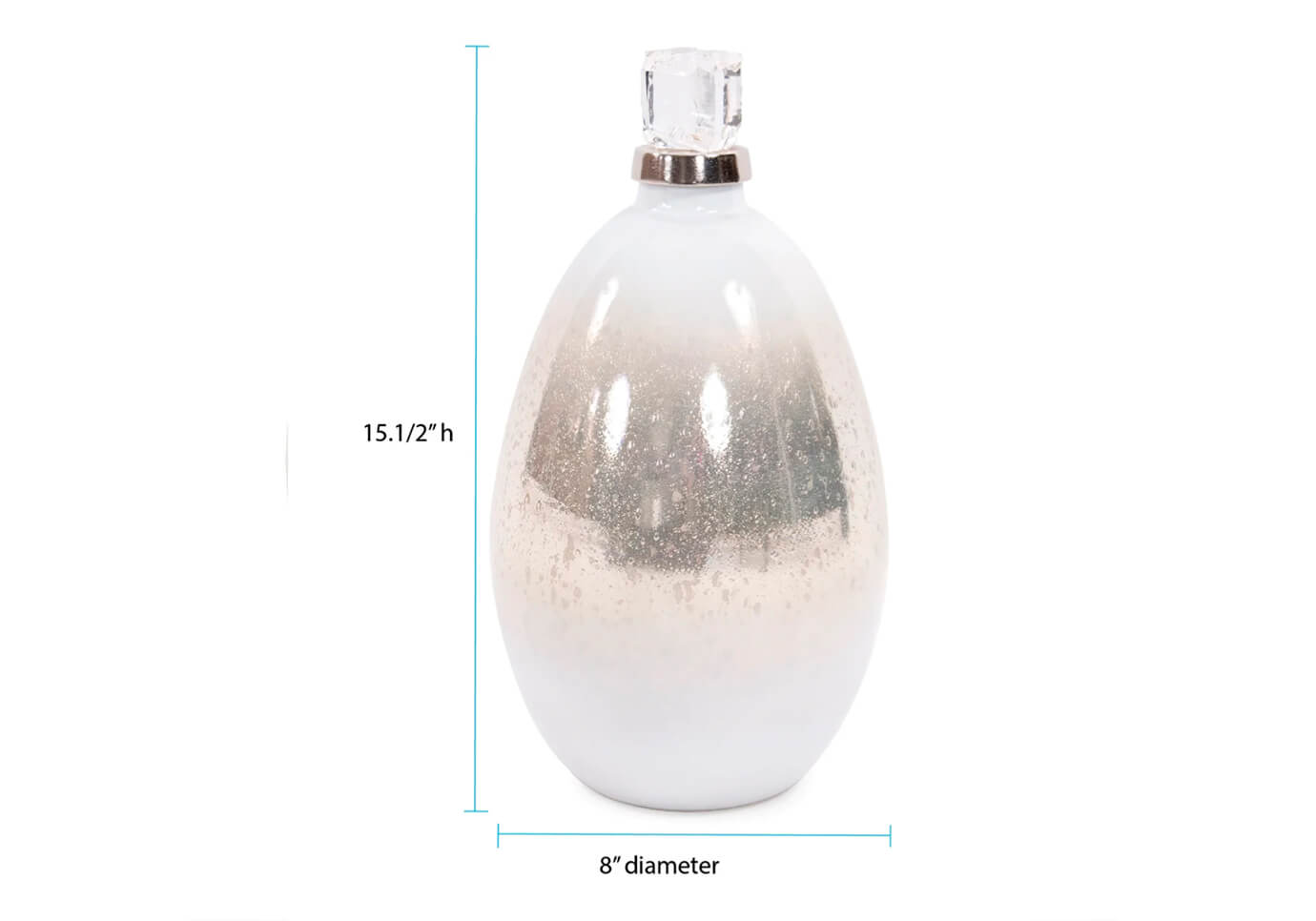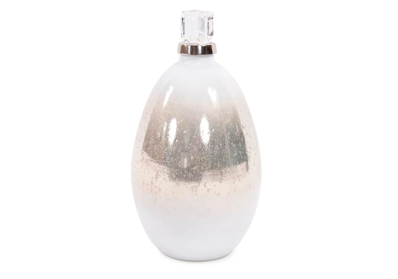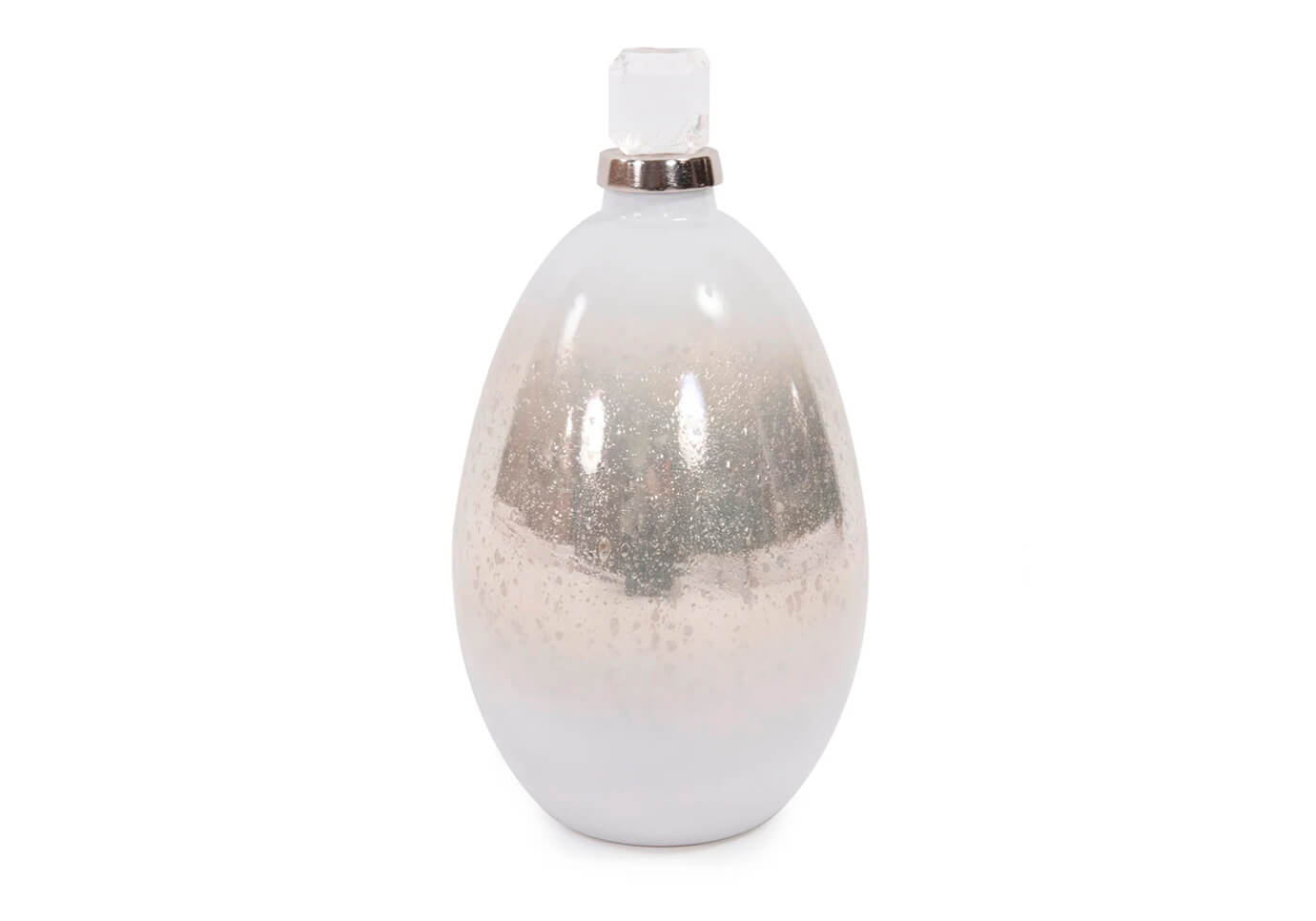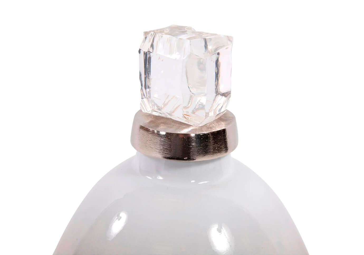 La botella decorativa de vidrio blanco soplado a mano perlado presenta una parte superior acrílica con borde plateado que da la ilusión de un glaciar flotando en el mar Ártico abierto. Combina el exclusivo acabado perlado plateado con detalles en aluminio fundido plateado. La tapa de acrílico no es removible. Combínalo con las otras piezas de la colección para completar el look.